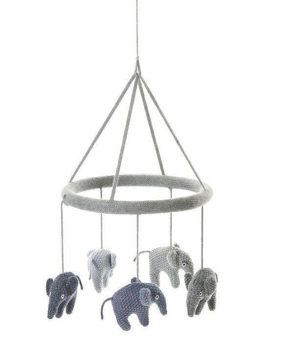 Nydelig håndheklet uro til å henge over sengen, fra danske Smallstuff. Denne har søte elefanter hengende